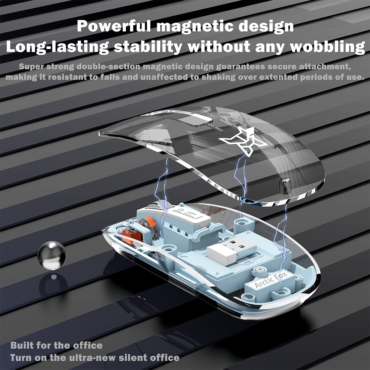 TRIPLE-MODE CONNECTION (BT5.1+BT5.1+2.4GHz) :: This AF wireless transparent mouse boasts an advanced Bluetooth 5.1 chip, ensuring a stable and low-latency connection. It also supports a reliable 2.4GHz wireless connection with plug-and-play convenience—no drivers needed. Switch effortlessly between up to three connected devices by touching the switch on the back.