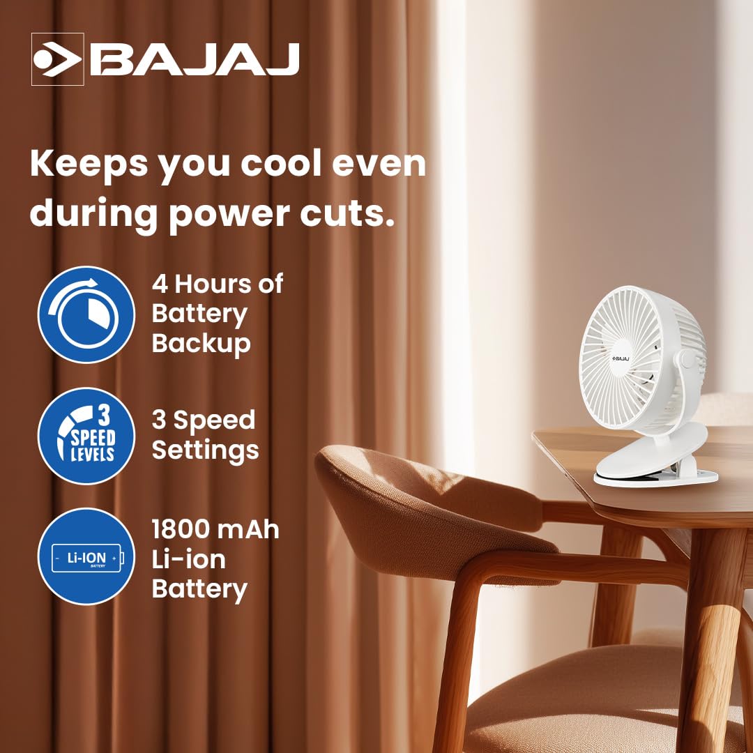 Bajaj Pygmy Mini Fan 110MM | USB Charging | Multi-Clip Function | Rechargeable | 4-Hr Back-up | Silent Operation | Longer Battery Life | Energy Efficient | Portable【White】
