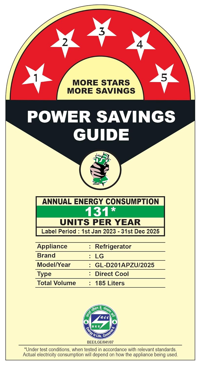 Energy Rating: 5 Stars Refrigerator – Best in class Efficiency (Higher star ratings lead to lesser electricity consumption lowering bills) | Annual energy consumption – 131 Units per year | BEE Label period – 01st Jan 2023 to 31st Dec 2025 | The revolutionary Smart Connect technology in LG Direct Cool refrigerator helps you connect your refrigerator to home inverter in case of power cuts. (T&C Apply)