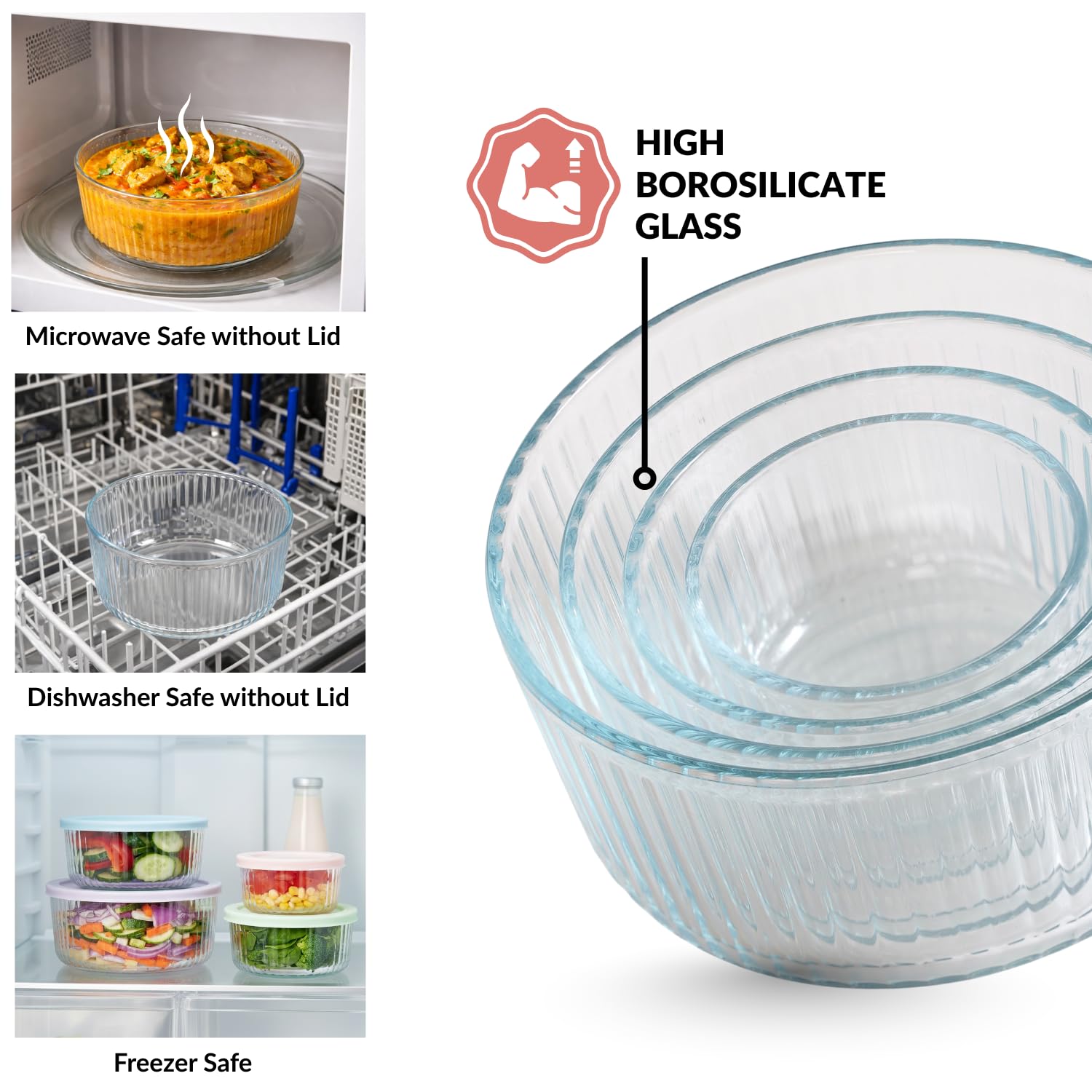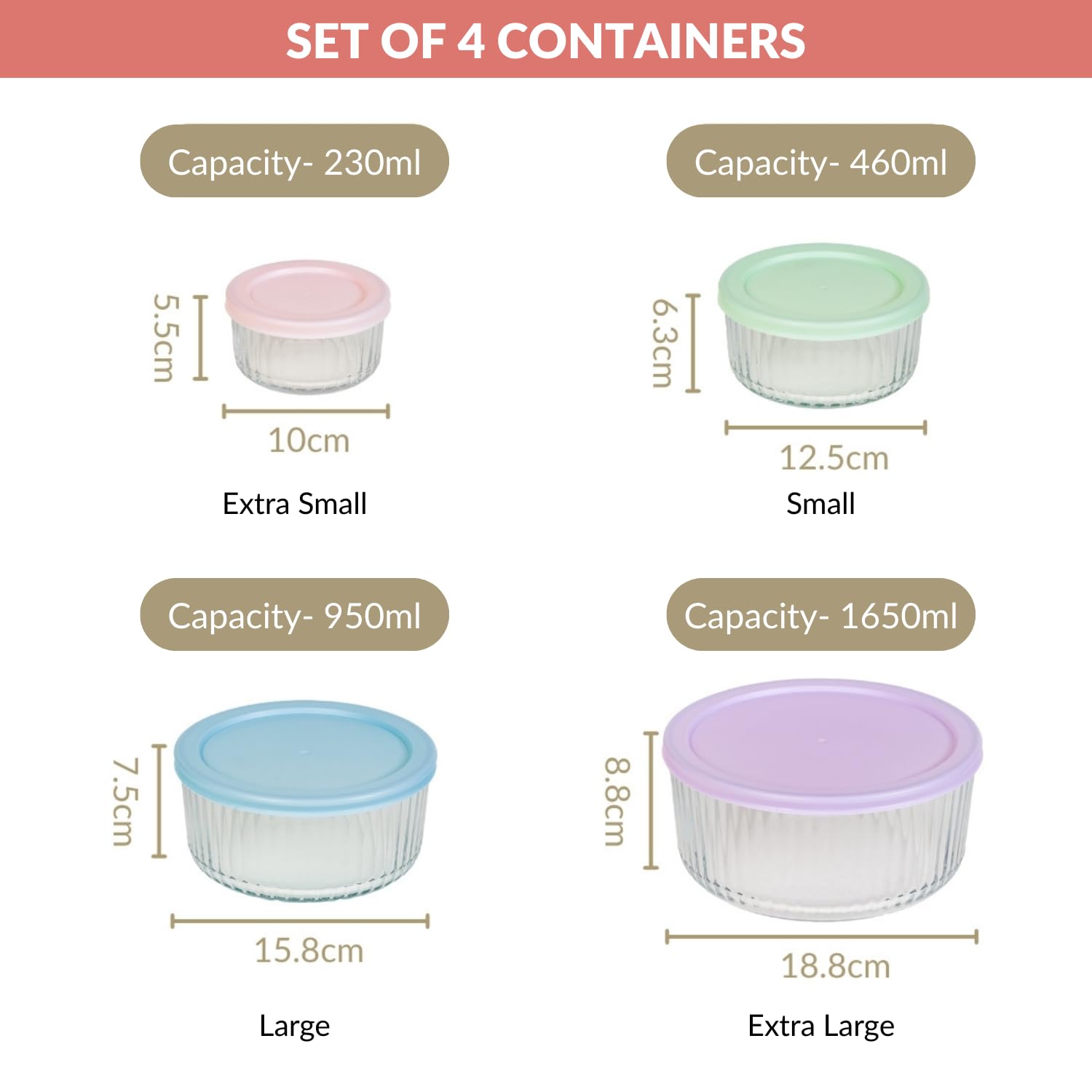 Nestasia Food Safe Glass Containers with Lid Set of 4 (XS-230ml, S-460ml, M-950ml, L-1650ml), Borosilicate Glass Containers for Fridge Storage, Microwave, Dishwasher & Refrigerator Safe, Transparent