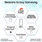 Samsung Exclusive Features : Fresh Room | Horizontal Curve Door Design | Stabilizer Free Operation (100v – 300v) | Smart Connect Inverter (Automatic) | Up to 15 days of fresh food | Lock & Key
