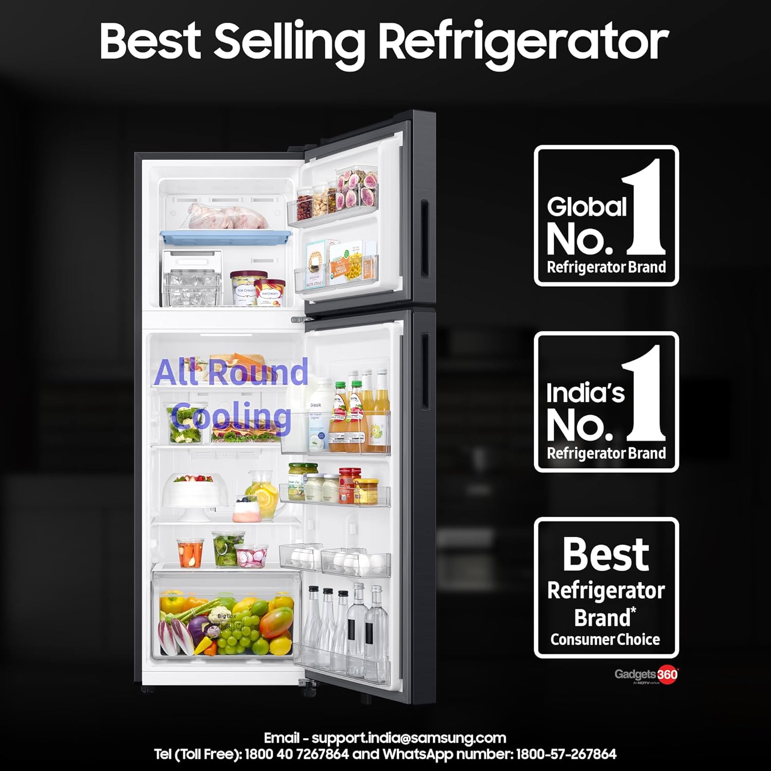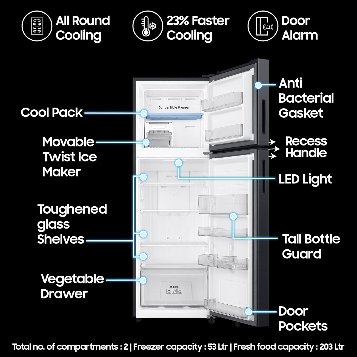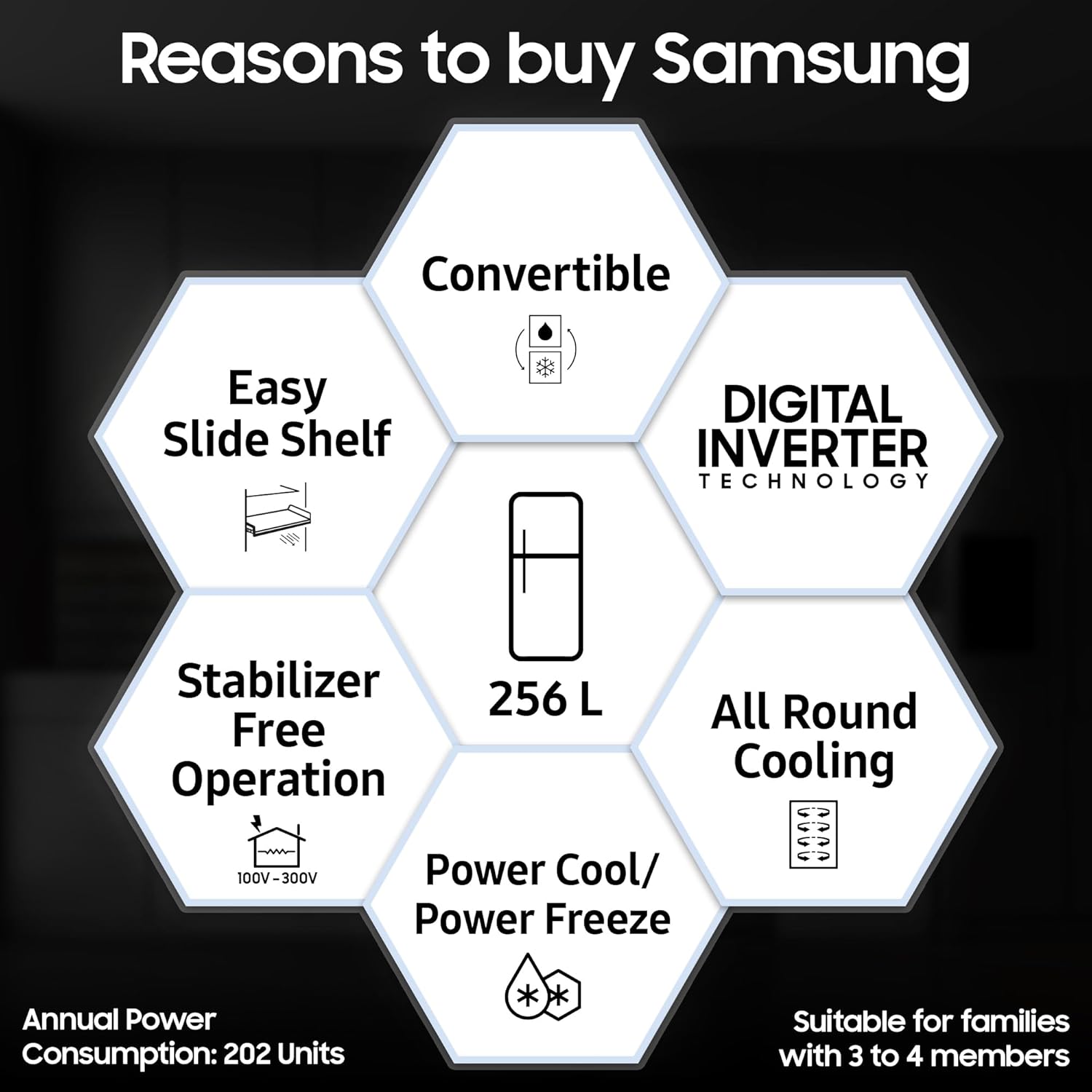 Samsung Exclusive Features : Convertible | Digital Display | Easy Slide Shelf | All Round Cooling