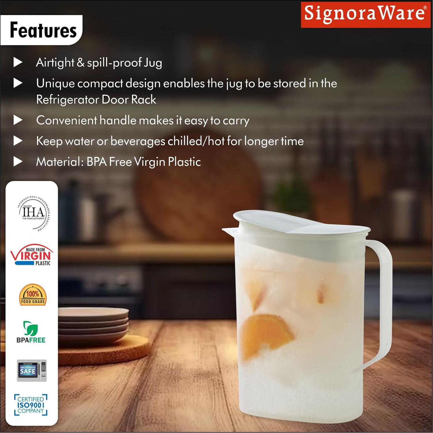 SignoraWare Ocean BPA free plastic Water Storage Jug | freezer safe | Convienient handle | Storage for Homemade Smoothies | Indoor and Outdoor Use | Serving for Gatherings (1.65 ltr | White)