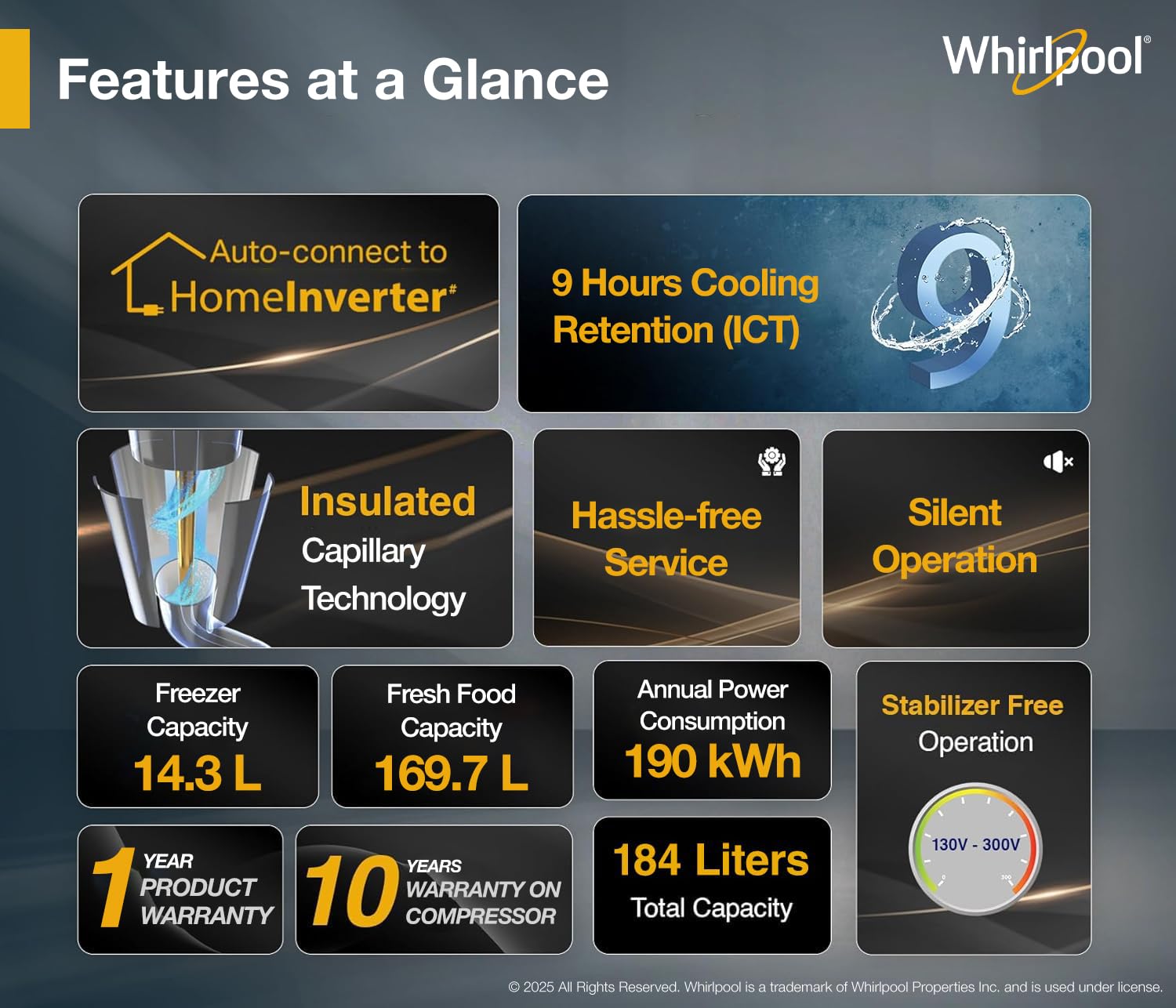 Brand Specific Features – Pedestal For Extra Storage, Jumbo Storage Up To 3, 2L Bottle Storage, Insulated Capillary Technology, Auto Connect To Home Inverter, Large Vegetable Crisper, Honey Comb Lock In Technology & Quick Chill Zone