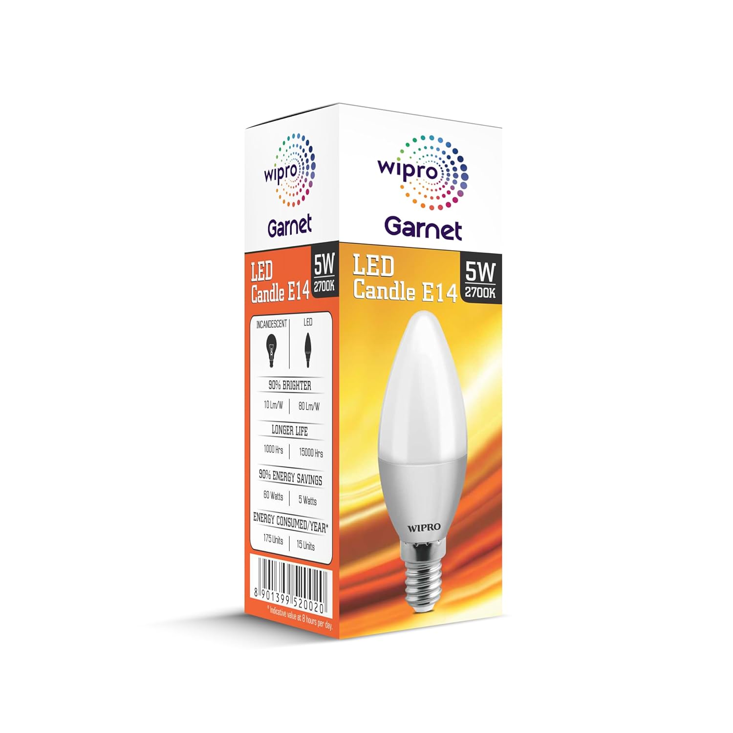 Wipro Garnet 5 W E14 Base Frosted Candle LED Bulb | Warm White (2700K) | Pack of 1 | Clear optics for sparkling effect | LED Filament Bulb for Home, office, chandellior, decorative lamp shade